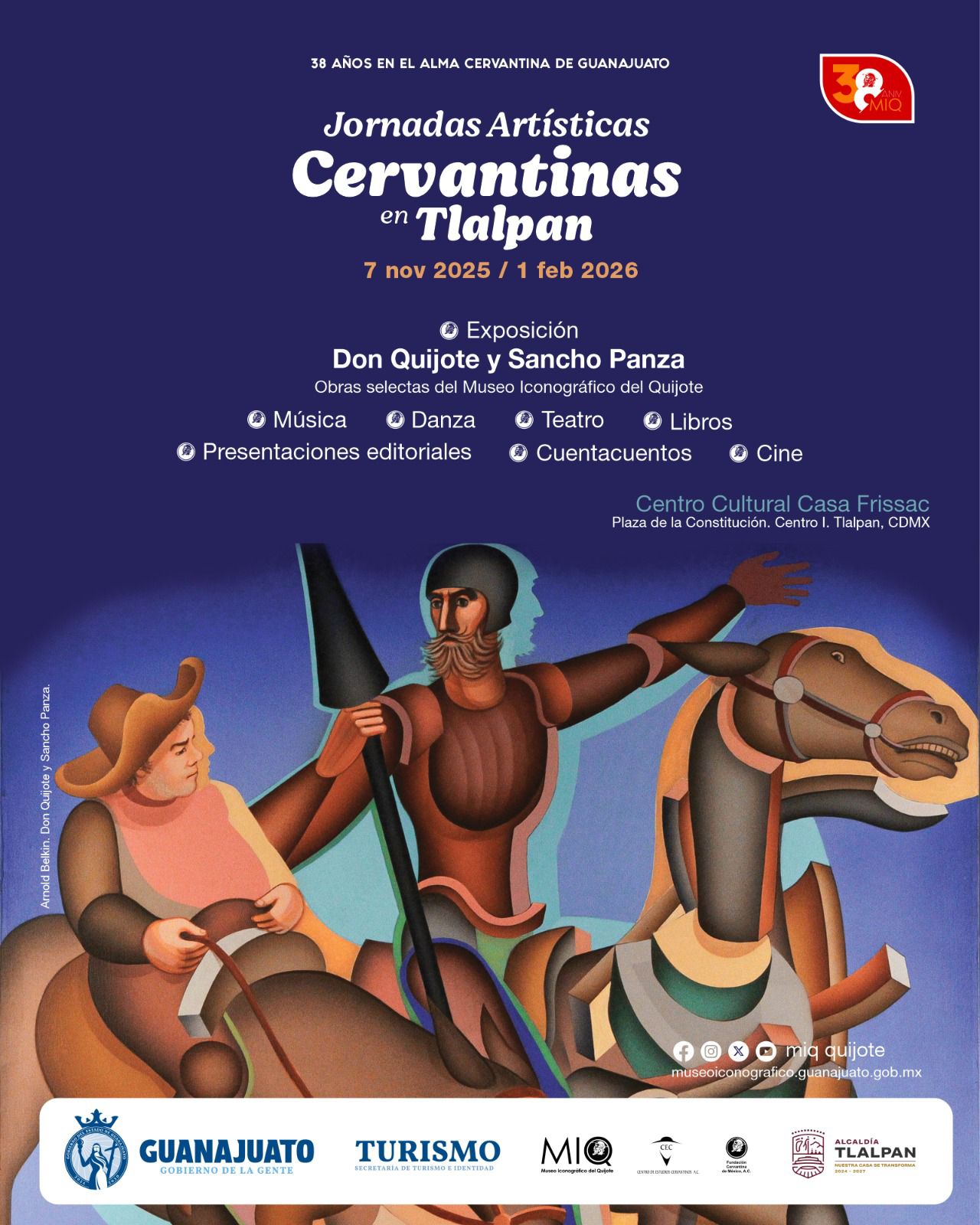 Las Jornadas inician este viernes 7, con la apertura de la exposición “Don Quijote y Sancho Panza”, en la que el público tlalpeño podrá apreciar en la Casa Frissac una porción significativa de la colección del MIQ, incluyendo piezas emblemáticas de autores como Arnold Belkin, Alberto Gironella, Gilberto Aceves Navarro y Fernando del Paso.