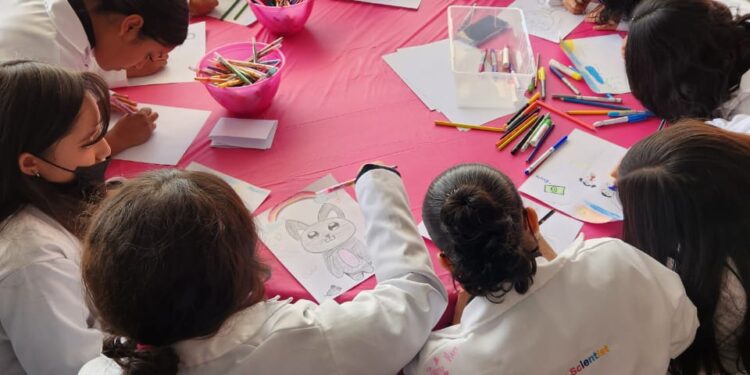 Las participantes, niñas de 11 a 15 años del Conalep, plantel Ciudad Azteca, estaban a punto de convertirse en científicas por medio de actividades divertidas: desde construir un avión de papel para aprender de la sustentabilidad, participar en la batería con fruta, y crear un gusano de polímeros (material con el que se crean desde carcasas de celulares hasta respaldos de asientos de automóvil), con el fin de incentivar a las niñas a estudiar una carrera científica.