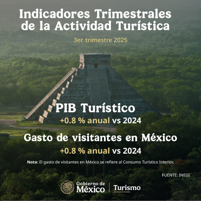 La secretaria de Turismo del Gobierno de México, Josefina Rodríguez Zamora, informó que, de acuerdo con los Indicadores Trimestrales de la Actividad Turística (ITAT), publicados por el Instituto Nacional de Estadística y Geografía (INEGI), el Producto Interno Bruto (PIB) Turístico registró un crecimiento de 0.8 por ciento en comparación anual, respecto al tercer trimestre de 2024, así como un incremento trimestral de 0.4 por ciento frente al segundo trimestre de 2025.