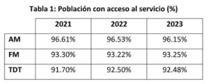 En cuanto a la evolución de los servicios de radiodifusión en el periodo 2021-2023, en la siguiente tabla se da cuenta del comportamiento en la cobertura poblacional de cada uno de los servicios analizados en el reporte: