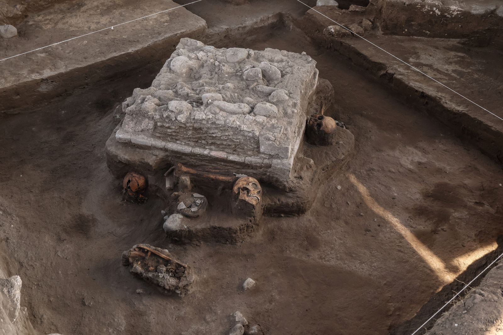 En el arranque del altar había dos cráneos, uno orientado hacia la parte superior y otro hacia el suroeste. Conforme descendieron los niveles, se detectó un apisonado con un estucado, posiblemente de cal con arena, y debajo de este se encontraron las otras dos osamentas incompletas, así como algunas vasijas.