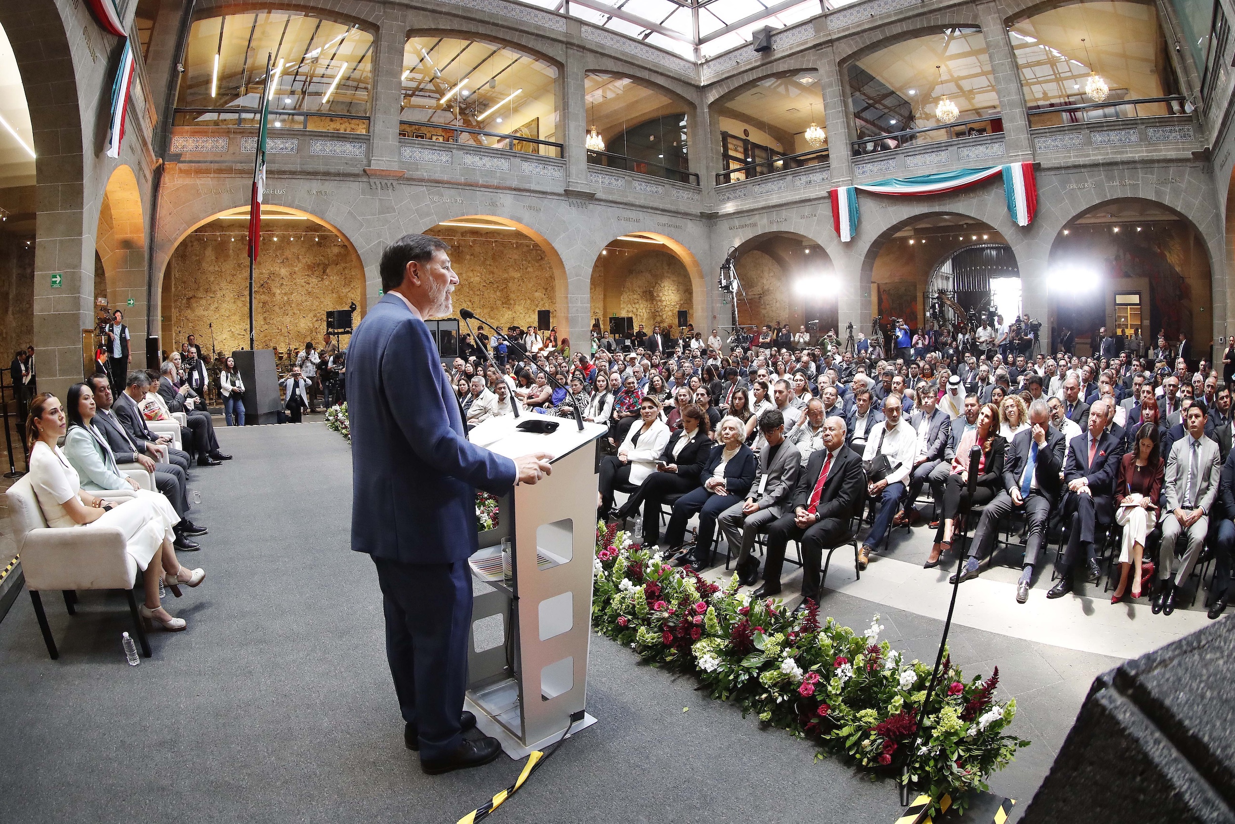 En el presídium acompañaron al senador Fernández Noroña el subsecretario de Gobernación, César Yáñez Centeno Cabrera, en representación de la presidenta Claudia Sheinbaum Pardo; el presidente de la Jucopo, senador Adán Augusto López Hernández; la gobernadora de Baja California, Marina del Pilar Ávila; la secretaria de Desarrollo Agrario, Territorial y Urbano, Edna Elena Vega Rangel; y el presidente de la Cámara de Diputados, Sergio Gutiérrez Luna.