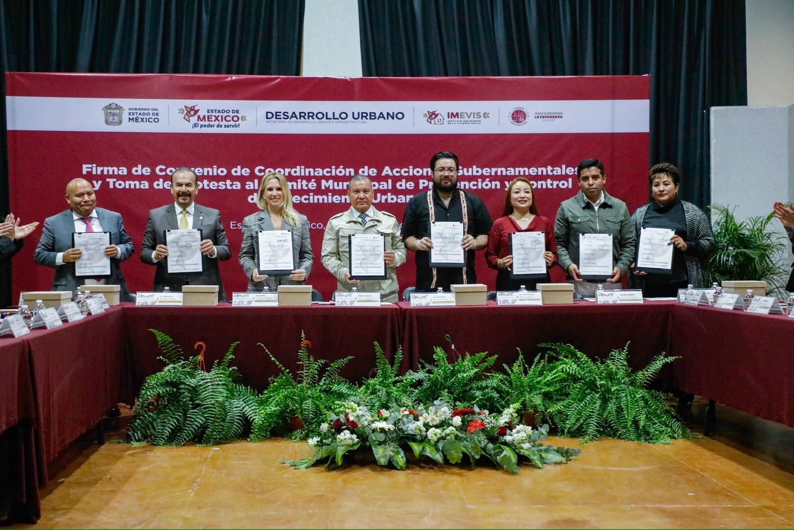 A fin de consolidar el derecho a la vivienda, la regularización del suelo en el municipio, así como promover el desarrollo urbano ordenado y llevar justicia social a las comunidades más olvidadas, el presidente municipal, Isaac Montoya Márquez, firmó el Convenio de Coordinación de Acciones Gubernamentales con el Instituto Mexiquense de la Vivienda Social (IMEVIS) y tomó protesta como parte del Comité Municipal de Prevención y Control del Crecimiento Urbano.