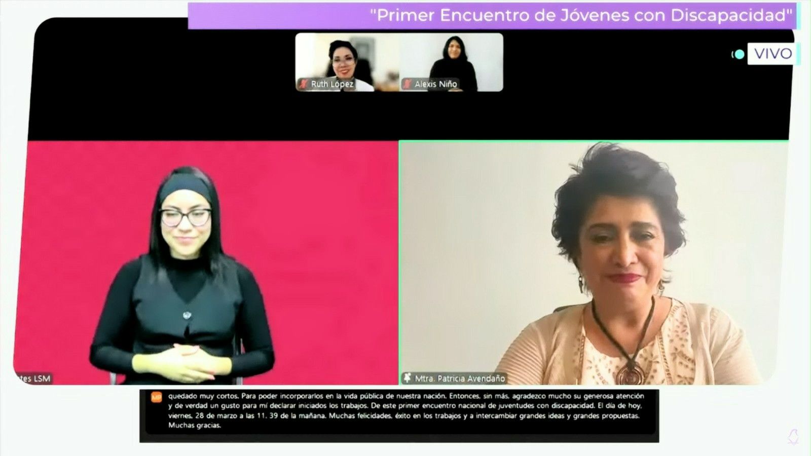 El encuentro también contó con la participación de Sofía Guadalupe Vargas Soriano, representante de la Red Mexicana de Jóvenes con Discapacidad, Jatzive Scarlet Bravo Martínez, representante de Ciudad Ke Ve, así como diversos representantes de este sector de la sociedad. El encuentro, efectuado de manera virtual, se puede visualizar desde el siguiente enlace: https://www.youtube.com/live/NEr7ZHZ4AkY
