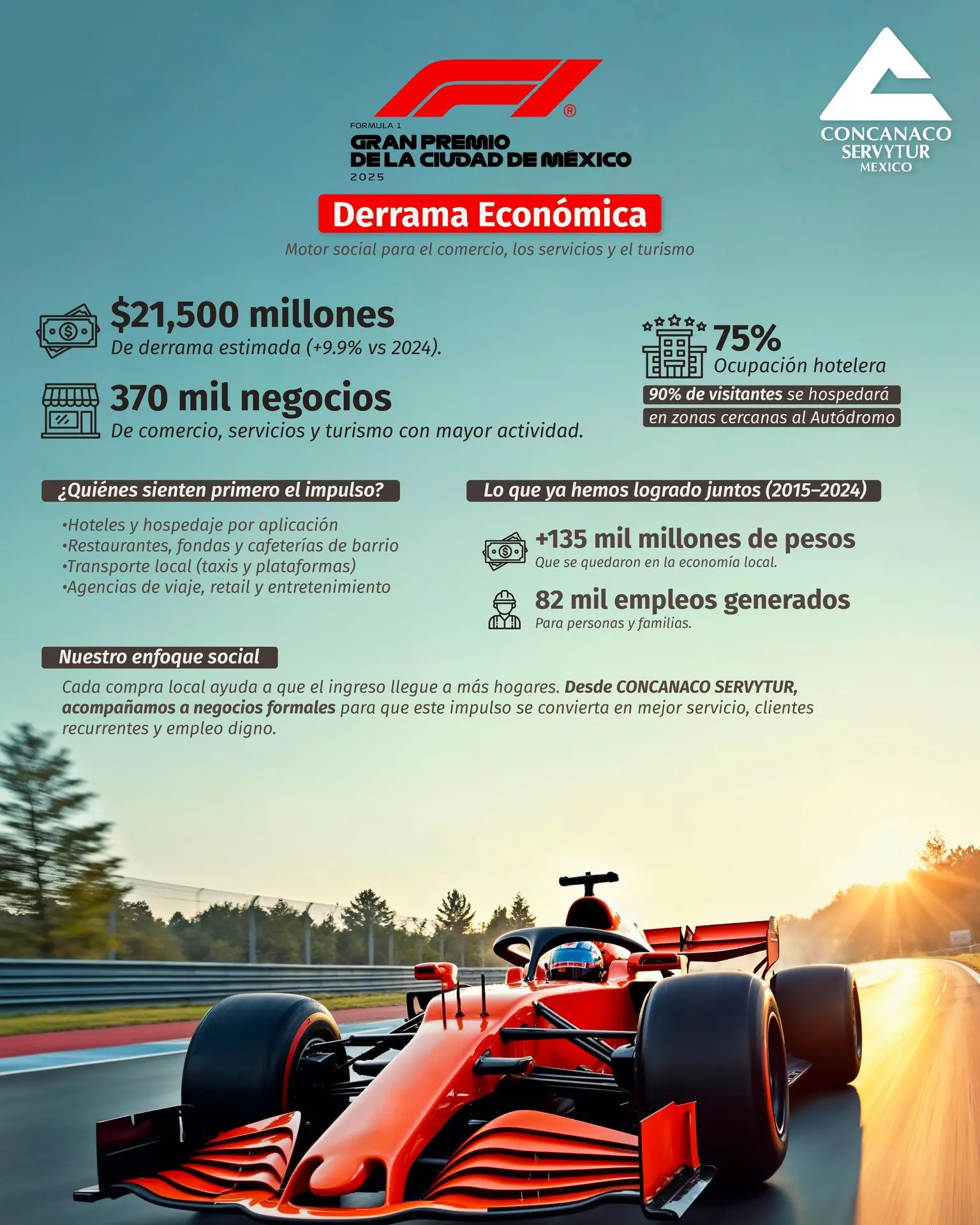 La Confederación de Cámaras Nacionales de Comercio, Servicios y Turismo de los Estados Unidos Mexicanos (CONCANACO SERVYTUR MÉXICO) informó que el Gran Premio de México 2025 será un motor social y económico para miles de negocios y familias, con más de 20 mil millones de pesos en derrama estimada en la Ciudad de México durante el fin de semana de la carrera.