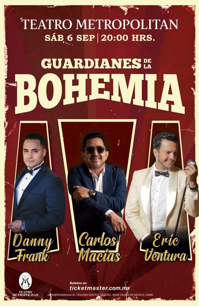 El Teatro Metropolitan, ícono cultural de la Ciudad de México, se engalanará este sábado 6 de septiembre a las 20:00 horas para recibir a tres pilares de la música romántica y bohemia en el espectáculo «Guardianes de la Bohemia», un concierto que reunirá en un mismo escenario a Danny Frank, Carlos Macías y Eric Ventura, tres generaciones de talento que han definido la mirada romántica y sentimental mexicana. Con boletos disponibles a través de Ticketmaster y en taquillas del recinto, esta velada promete ser un viaje emotivo por los grandes éxitos del bolero, la trova y el pop romántico, arropado por la acústica magistral de uno de los teatros más emblemáticos del país. Boletos a la venta en el Sistema Ticketmaster y en taquillas del inmueble
