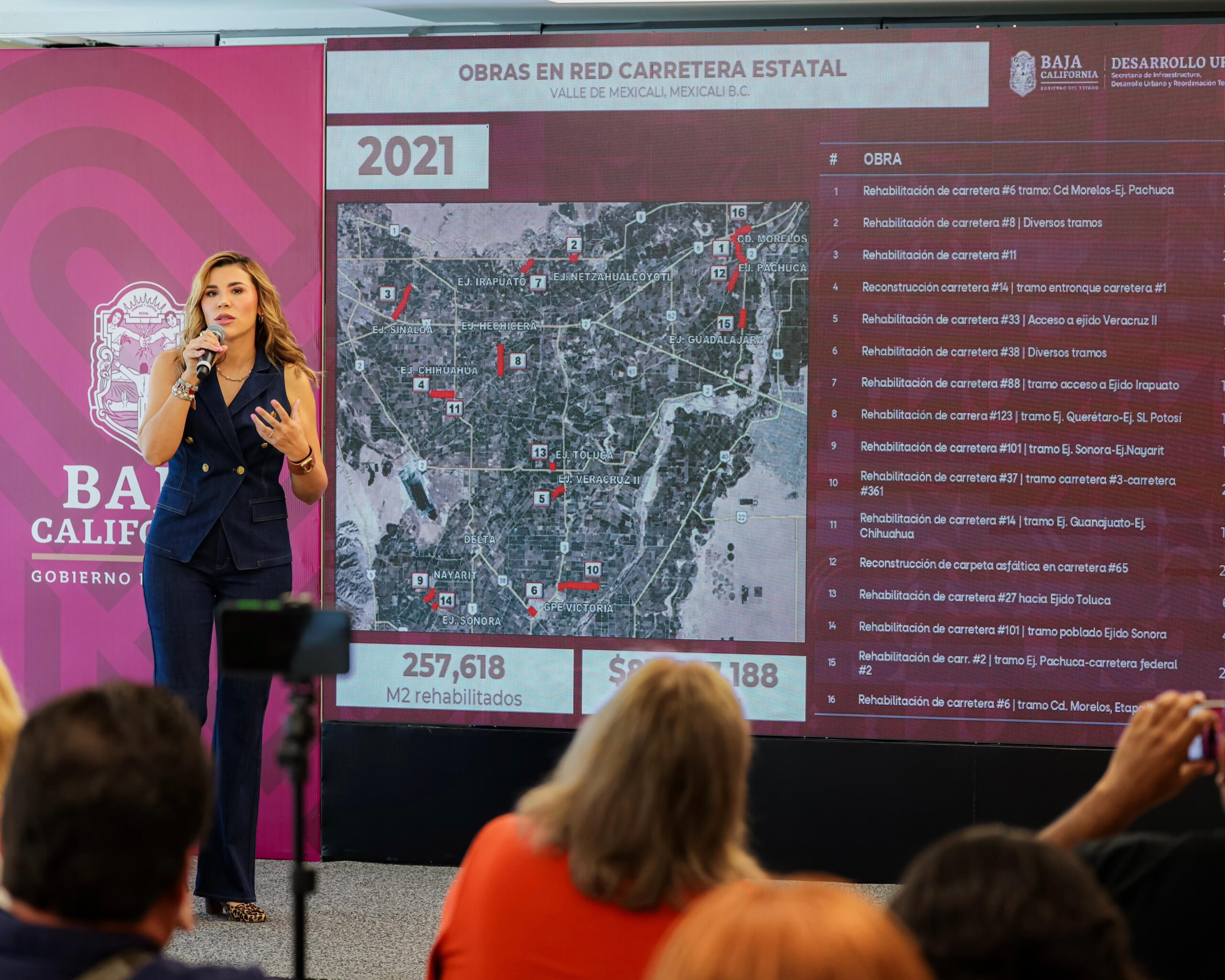La mandataria destacó que, entre 2021 y 2025, en el Valle de Mexicali se han rehabilitado más de 605 mil metros cuadrados de carreteras, con una inversión superior a los 315 millones de pesos, beneficiando a miles de familias en zonas agrícolas y ejidales. Este monto es adicional a las mega obras impulsadas a través del programa RESPIRA.