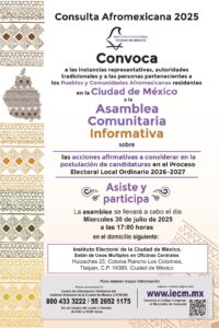 • El IECM convoca a instancias representativas, autoridades tradicionales y a personas pertenecientes a pueblos y comunidades afromexicanas a participar en la Asamblea Comunitaria Informativa el 30 de julio, a las 17:00 horas, en su sede central