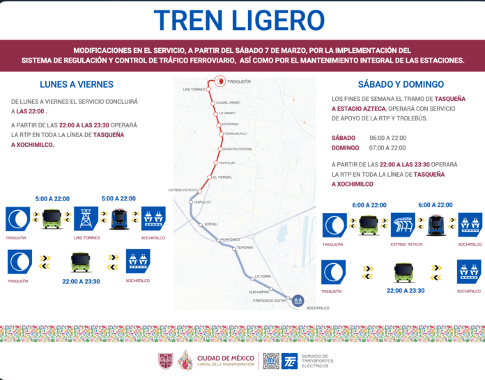 De lunes a viernes el servicio del tren ligero concluirá a las 22:00 horas, a partir de esa hora se contará con el apoyo de unidades de la Red de Transporte de Pasajeros (RTP) y trolebuses de Tasqueña hasta Xochimilco. Sábado de 06:00 a 22:00 operará servicio de apoyo de la RTP de Tasqueña a Estadio Azteca y de Estadio Azteca a Xochimilco las personas usuarias podrán continuar su viaje en el tren ligero.