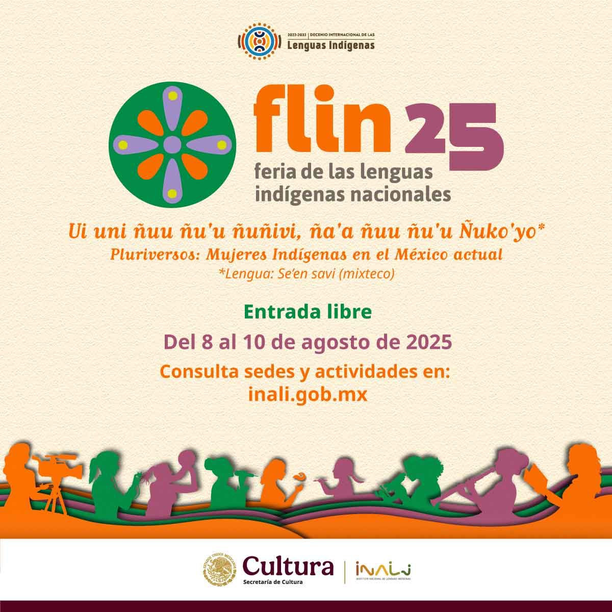 Con el lema “Ui uni ñuu ñu’u ñuñivi, ña’a ñuu ñu’u Ñuko’yo” (Pluriversos: mujeres indígenas en el México actual), la Secretaría de Cultura del Gobierno de México, a través del Instituto Nacional de Lenguas Indígenas (INALI), realizará la novena edición de la Feria de las Lenguas Indígenas Nacionales (FLIN), en el marco del Año de la Mujer Indígena y el Día Internacional de los Pueblos Indígenas, que tiene como objetivo visibilizar y reconocer el papel, la esencia y el liderazgo de las mujeres indígenas desde distintos ámbitos.