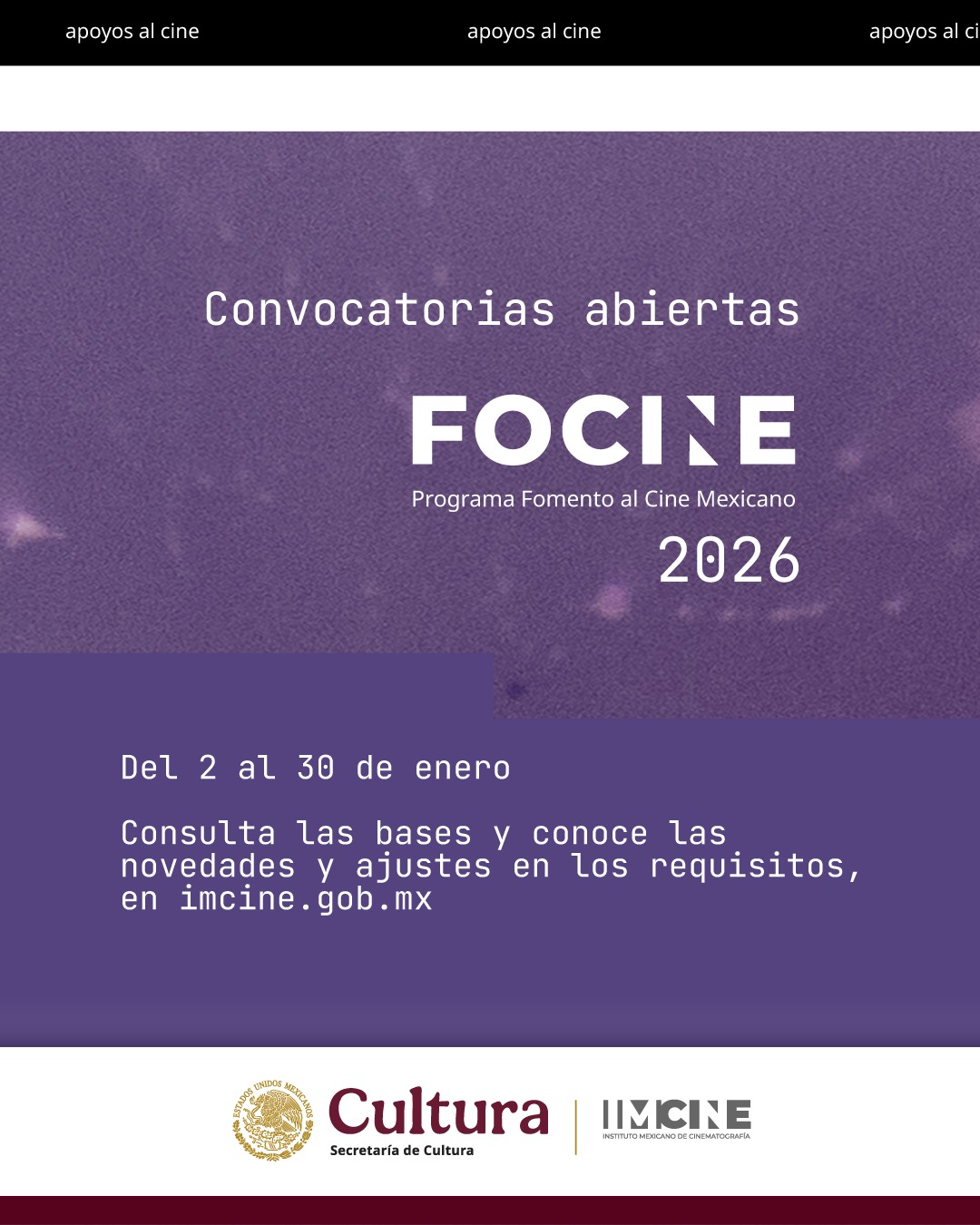 Hasta el 30 de enero de 2026, el programa Fomento al Cine Mexicano (Focine) abre la convocatoria de sus 12 modalidades de apoyo (en sus variantes de producción, distribución y exhibición).