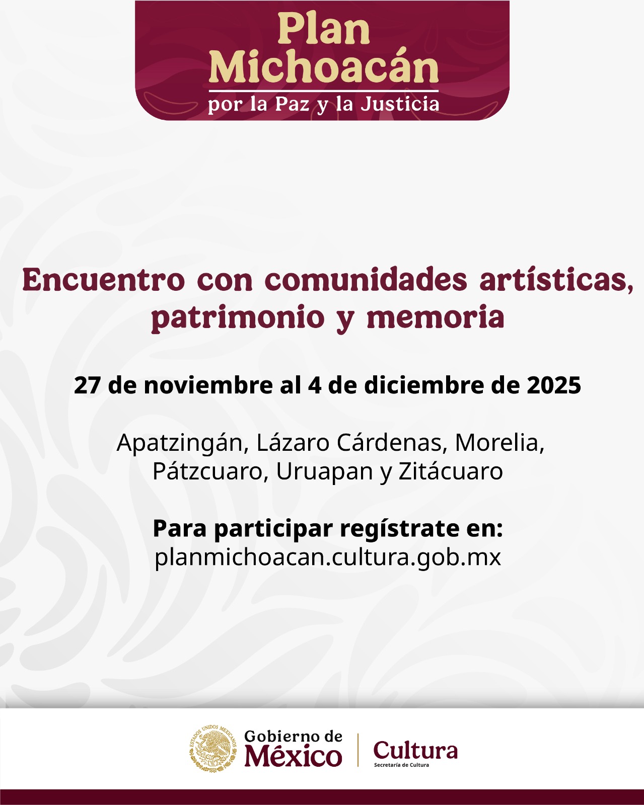 Como parte del Plan Michoacán por la Paz y la Justicia, que impulsa la Presidenta Claudia Sheinbaum Pardo, la Secretaría de Cultura del Gobierno de México, convoca al Encuentro “Comunidades artísticas, patrimonio y memoria”, un espacio de diálogo, escucha y articulación con personas creadoras, artistas, investigadoras, gestoras, portadoras y agentes culturales de Michoacán.