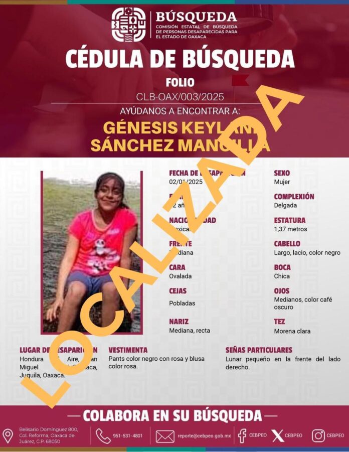 Oaxaca de Juárez, Oax. 5 de enero de 2025. La Comisión Estatal de Búsqueda de Personas Desaparecidas de Oaxaca confirma la localización con vida de Génesis Keylani Sánchez Mancilla, reportada como desaparecida el pasado 2 de enero.
