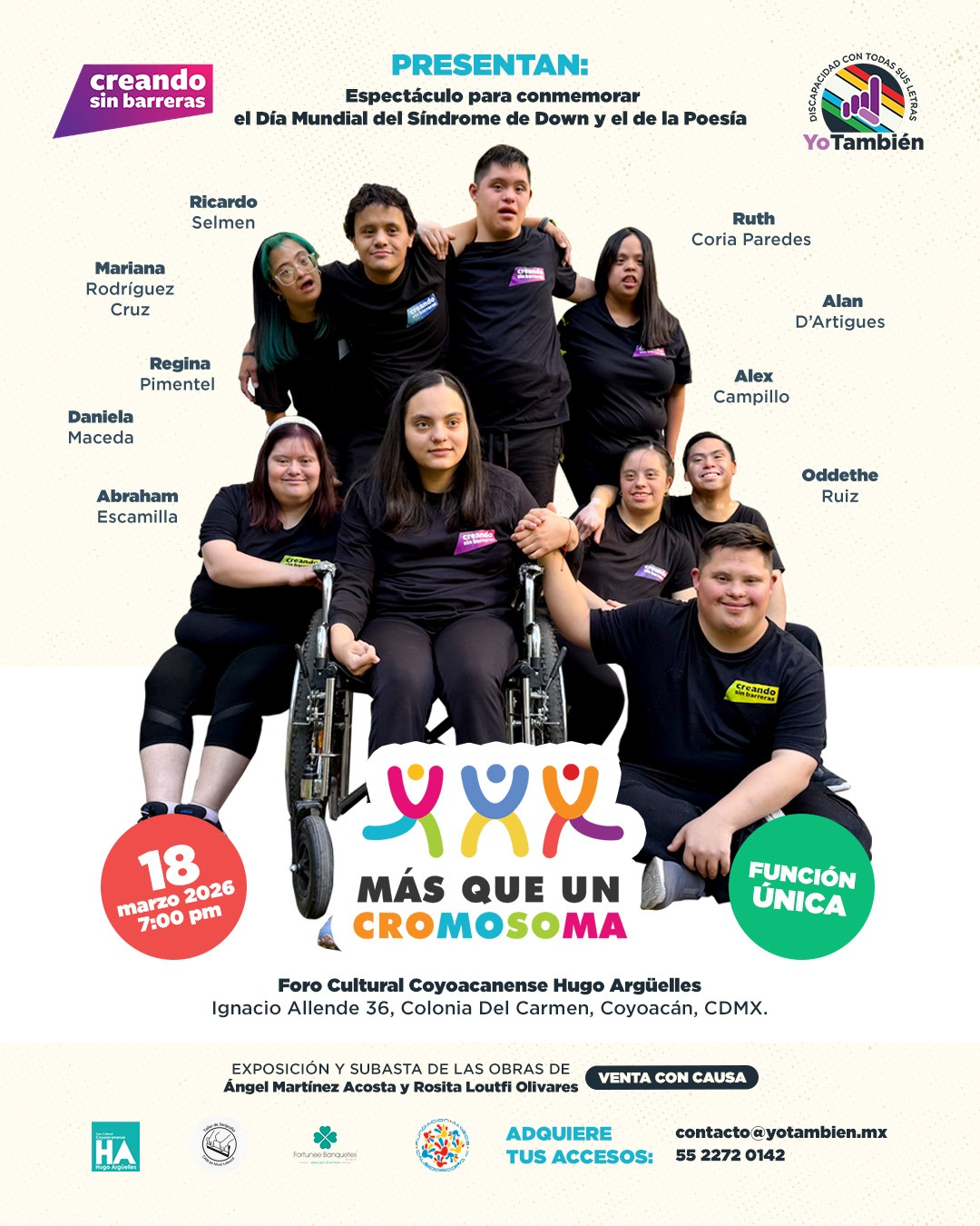 Bajo la dirección artística de Tanya Selmen y la dirección escénica de Jorge Chávez Caballero, los actores y actrices Ricardo Selmen, Alan D´Artigues, Abraham Escamilla, Regina Pimentel, Oddethe Ruiz, Daniela Maceda, Alex Campillo, Ruth Coria Paredes y Mariana Rodríguez Cruz aportarán su talento para reforzar que cada persona es mucho más que una condición genética. Su presencia fortalece el diálogo entre arte, empatía y la construcción de una sociedad más justa e incluyente.