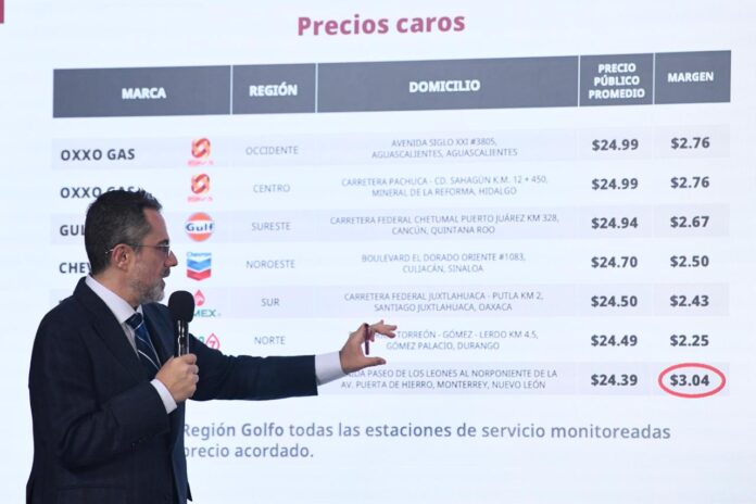 “Continuamos con mesas de trabajo permanentes con empresarios gasolineros para bajar el precio promedio a $28.00 pesos y vamos a seguir con ese esfuerzo”, dijo el procurador durante su participación en la conferencia Mañanera del Pueblo que encabeza la mandataria.