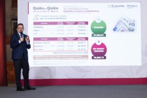 En cuanto a la información recabada por el Quién es Quién en el Envío de Dinero, el servidor público subrayó que tras el ejercicio de envío de 400 dólares, con precios y tipo de cambio observados al 16 de abril, Financiera para el Bienestar (Finabien) encabeza la lista de las empresas que pagaron más en depósito a cuenta o transferencia, ya que pagó $7,062.81 pesos, y la que dio menos fue Ria Money Transfer ($6,696.72 pesos).