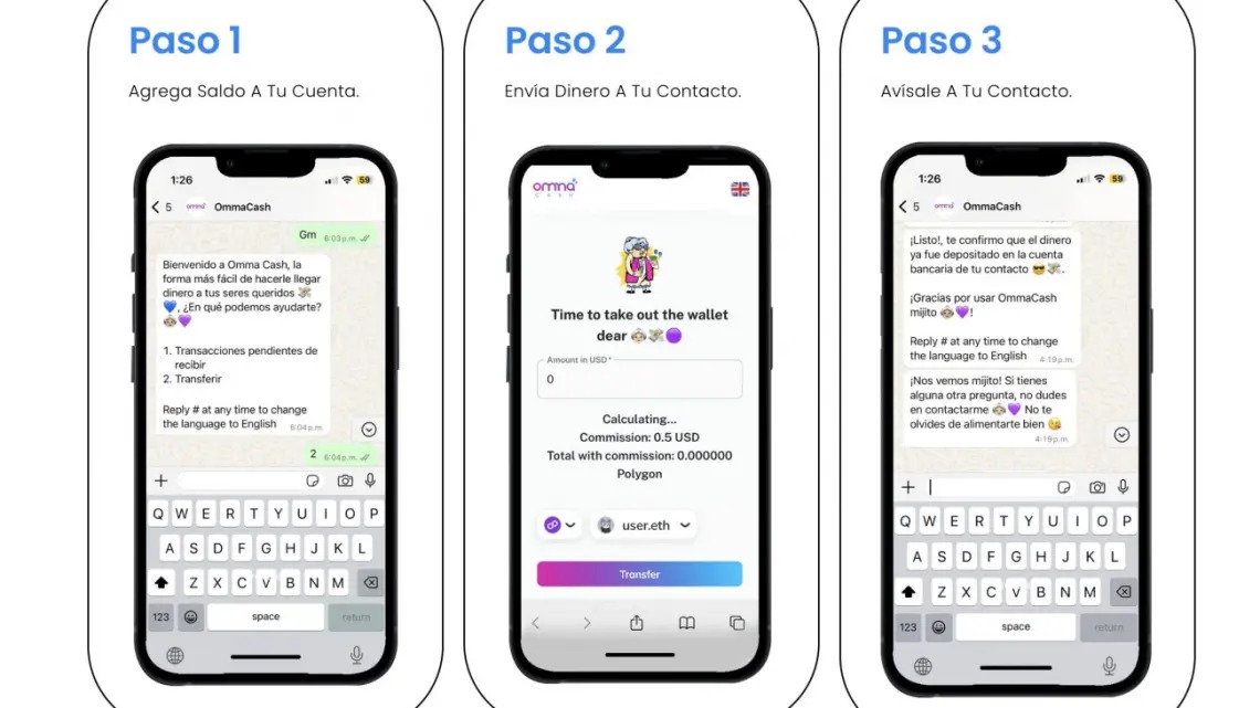 A través de un proceso operado por WhatsApp, OmmaCash permite enviar remesas desde Estados Unidos en tan solo unos minutos y con comisiones mucho más bajas que las de las remesadoras tradicionales. Mientras que el envío tradicional puede costar hasta 65 dólares y demorar entre 6 y 48 horas, la plataforma ofrece transferencias desde solo 1 dólar utilizando tecnología blockchain.