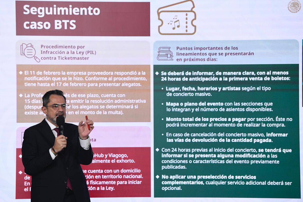 En información actualizada del caso de la venta de boletos para los conciertos que ofrecerá la agrupación BTS en México, sobre el Procedimiento por Infracción a la Ley (PIL) contra Ticketmaster, el procurador expuso que el pasado 11 de febrero esta empresa respondió a la notificación que se le hizo, por lo que conforme al procedimiento tiene hasta el 17 de febrero para presentar alegatos.