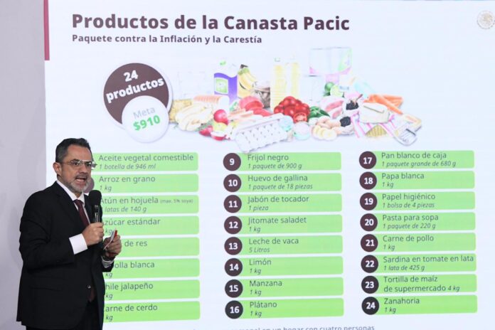 Explicó que al inicio de la estrategia Pacic, en 2022, el precio de esta canasta se fijó en $1,039.00 pesos y al renovar la mandataria este acuerdo con la agroindustria y cadenas de tiendas de autoservicio, se acordó reducir el precio a $910.00 pesos.