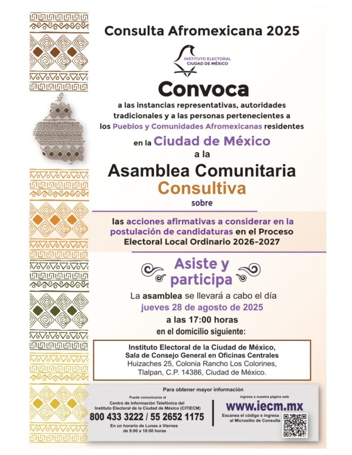 El Instituto Electoral de la Ciudad de México (IECM) promueve la participación de la comunidad afrodescendiente en el diseño de las acciones afirmativas que se aplicarán en el Proceso Electoral Local Ordinario 2026-2027, con ese propósito realizará la Asamblea Comunitaria Consultiva, que se llevará a cabo en las oficinas centrales organismo público local, el próximo jueves 28 de agosto.