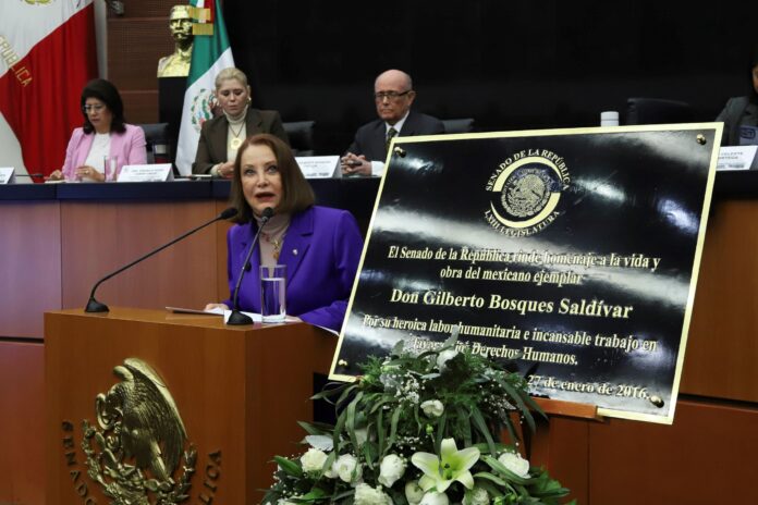 La senadora destacó que haber dado el nombre de Gilberto Bosques al Centro de Estudios Internacionales de la Cámara de Senadores es un recordatorio de que la diplomacia ejercida con vocación humanista contribuye a un mundo más justo, al ser el poblano alguien que se negó a ser indiferente ante la persecución y la violencia.