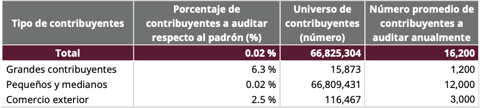 A partir de la identificación de dichas conductas se prioriza el inicio de auditorías a los contribuyentes que presentan mayores calificaciones de riesgo. Para 2026 se considerará abrir el siguiente número de auditorías de acuerdo al padrón auditable correspondiente: