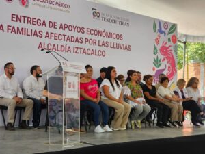 La alcaldesa de Iztacalco, Lourdes Paz Reyes y la jefa de Gobierno de la Ciudad de México, Clara Brugada Molina, encabezaron la entrega de apoyos económicos a 120 familias de la demarcación que resultaron afectadas por las recientes inundaciones.