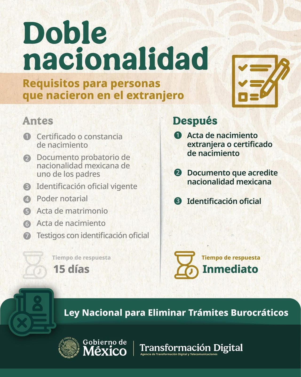 La Agencia de Transformación Digital y Telecomunicaciones informó que obtener la doble nacionalidad ahora es más fácil. La solicitud se vuelve más sencilla, sin trámites largos ni requisitos excesivos, y el proceso pasa de tardar 15 días a ser inmediato.