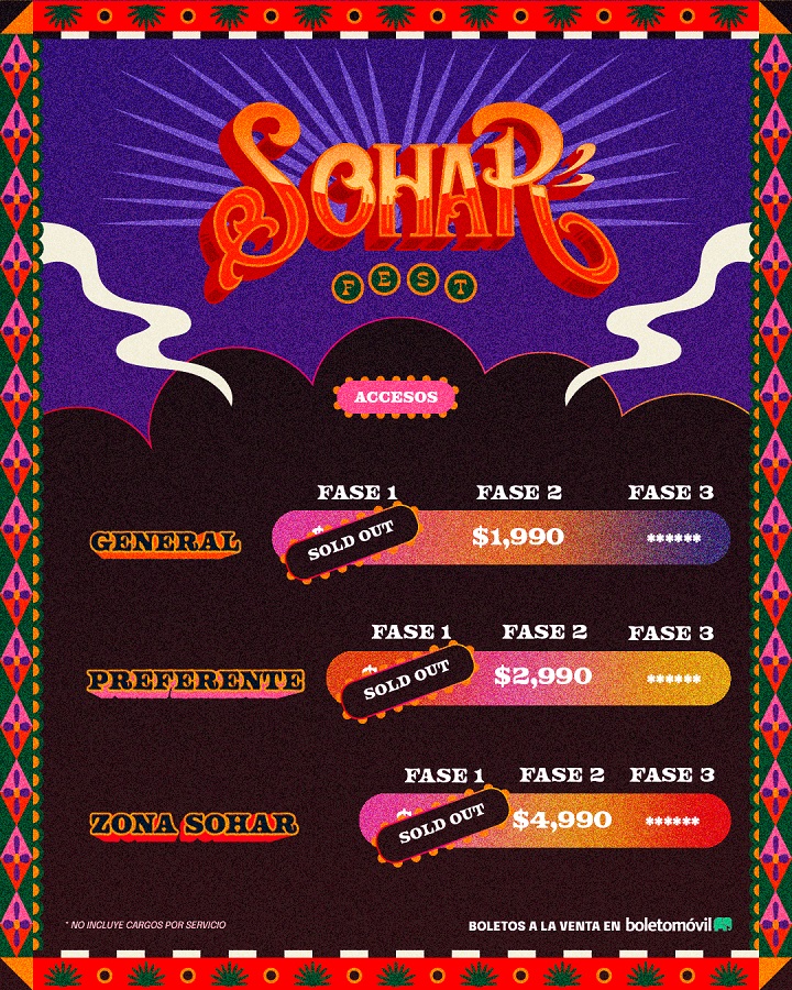 Los boletos para el Sohar Fest continúan a la venta en su segunda fase, con precios que van desde los 1,990 en Zona General; Zona Preferente 2990 y 4,990 en la exclusiva Zona Sohar, que ofrece una experiencia premium con beneficios especiales. Sin embargo, debido a la rapidez con la que se agotó la primera fase, se recomienda adquirirlos pronto, ya que se espera un nuevo incremento de precio al pasar a la Fase 3, la cual podría anunciarse en cualquier momento.